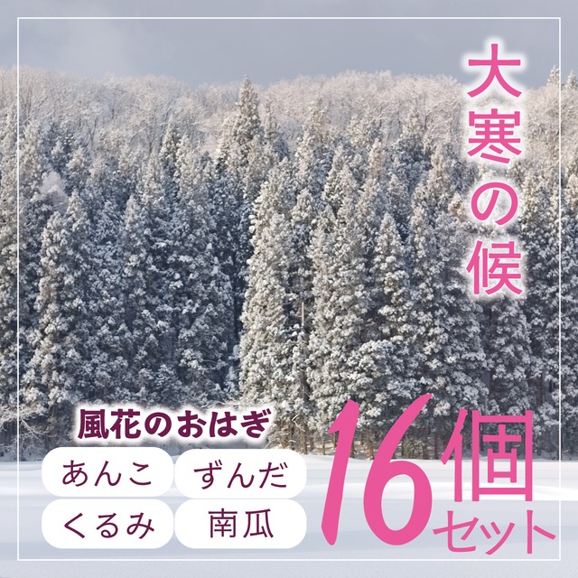 冷凍おはぎ16個セット 厳選した山形県真室川町とその周辺エリアの地元食材を贅沢に使用し、手間ひまかけてこしらえる冷凍おはぎの16個(4種×4個)セットです。 ※4種類のおはぎを1個ずつ詰め合わせてパッキングしたトレーが4つ入っています。 お届けするのは、二十四節季七十二候では「大寒」の初候にあたる「款冬華 (ふきのはなさく)」の頃。 厳しい寒さの中、フキノトウの黄色いつぼみがそっと顔を出す頃とされていますが、雪国のフキノトウが咲くのはまだまだ先のこと。さらさらとしたパウダースノーが里山にもしんしんと降り積もり、蔵王山では樹氷や氷瀑が成長する頃です。 一年で最も寒いこの季節。雪国のフキノトウは、深い雪の下で春の芽吹きへの支度を整えています。そんな季節にぴったりなおはぎ4種をセレクトしました。 フキノトウのように寒いなかでも頑張るご自身やご家族のご褒美に、春を待つ大切な方への贈り物にいかがでしょう。 皆さまのホッとするひと時に、私たちのおはぎがご一緒できることを楽しみにしております。 ■内容物/使用食材/(アレルギー表示)について ①あんこ×4 / 真室川町中ノ瀬の髙橋喜久子さんの小豆 ②くるみ×4 / 戸沢村の田中啓子さんの鬼胡桃、豆腐、醤油 ③ずんだ×4 / 真室川町共栄の佐藤和彦さんの枝豆[秘伝豆を予定]、大豆 ④かぼちゃ×4 / 真室川町木ノ下のあべ農場さんの南瓜[ダークホース]、レーズン ・もち米 / 真室川町釜淵の賢人さんのヒメノモチを使用 ・塩 / 石川県珠洲市の中前製塩さんの天日塩(揚げ浜式製塩)を使用 ・その他 / 三温糖、グラニュー糖、トレハロース、寒天加工品 (一部に大豆、くるみを含む) ■着色料およびサイズについて 着色料を一切使用しておりません。素材本来の色や風味を活かしたおはぎとなっています。サイズは小ぶりで食べやすい大きさです(通常店舗で提供しているおはぎより大きめのサイズとなっています)。 ■素材および製造について 山形県最上地域産の食材にこだわり、特に真室川町に伝わる伝承野菜の豆類や上質なもち米を農家から直接仕入れて使用しており、製餡もすべて自社で行っております。一部の調味料等を除き、目も足も届く範囲の素材を用いて、手間ひまかけて手作りしていますので、安心してご賞味ください。 ■保存方法および解凍方法 冷凍保存でお届けしますので、商品到着後はすぐに冷凍庫に入れて保存してください。解凍後はできるだけ早めにお召し上がりください。また、解凍方法は常温または冷蔵庫での自然解凍をお勧めします。(美味しくお召し上がりいただけるよう、解凍方法を記載した案内を商品に同封します) ■発送・注文に関する情報や注意事項 こちらの商品は受注生産にてお作りします。1月13日までにご注文ください。 出荷予定日は1月22日で、お届けの最短は以下の通りです。 翌日午前中:東北~関東地域、新潟県・富山県・長野県 翌日午後:中部~関西地域、石川県・福井県 翌々日午前中:北海道、中国~四国~九州~沖縄(本島一部) 翌々日午後以降:本州一部離島、沖縄離島 上記到着予定日時以降で受取り希望の日時がございましたらお知らせください。 ご指定いただける時間帯は、午前中/14~16時/16~18時/18~20時/19~21時のいずれかです。 ■その他の情報や注意事項 素材本来の風味を大切にした手作りおはぎのため、色や形が多少異なる場合がございます。あらかじめご了承ください。 お問い合わせは、ショップのお問い合わせページからお気軽にご連絡ください。